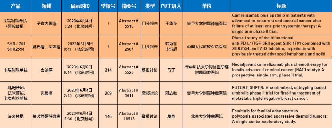 妇科肿瘤:“双艾”组合再显身手在妇科肿瘤领域,卡瑞利珠单抗、阿帕替尼、SHR-1701等产品的单药或联合治疗方案相关研究共有5项研究入选(包括1项口头报告、1项壁报讨论、2项壁报展示和1项线上发表)。