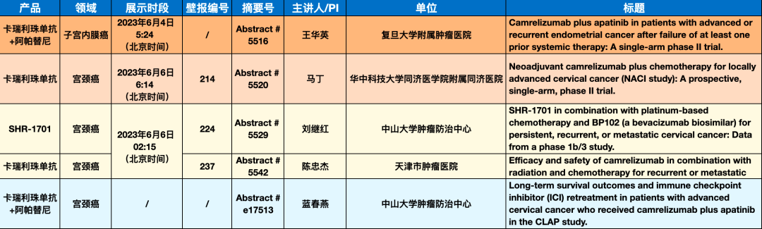 (注:下文表格中橙色背景代表口头报告、浅红色背景代表壁报讨论、黄色背景代表壁报展示、蓝色背景代表线上发表)由复旦大学附属肿瘤医院王华英教授担任主要研究者的“双艾”组合(卡瑞利珠单抗联合阿帕替尼)治疗子宫内膜癌的Ⅱ期研究被接收为口头报告。该研究入组36例患者,数据截至分析时间为2022年12月31日,中位随访时间为13.9(IQR: 5.8-23.2)个月。36例疗效可评估人群中,客观缓解率(ORR)为44.4%(95% CI: 27.9%,61.9%),2例完全缓解(CR),14例部分缓解(PR),16例疾病稳定(SD)。疾病控制率为88.9%(95% CI: 73.9%,96.9%),中位无进展生存期为6.4 (95% CI: 5.2, 13.0) 个月。卡瑞利珠单抗联合阿帕替尼在治疗既往接受过至少一种全身治疗失败的晚期或复发性子宫内膜癌患者中表现出令人鼓舞的抗肿瘤活性,有望为此类患者提供一种新的治疗选择。[2]